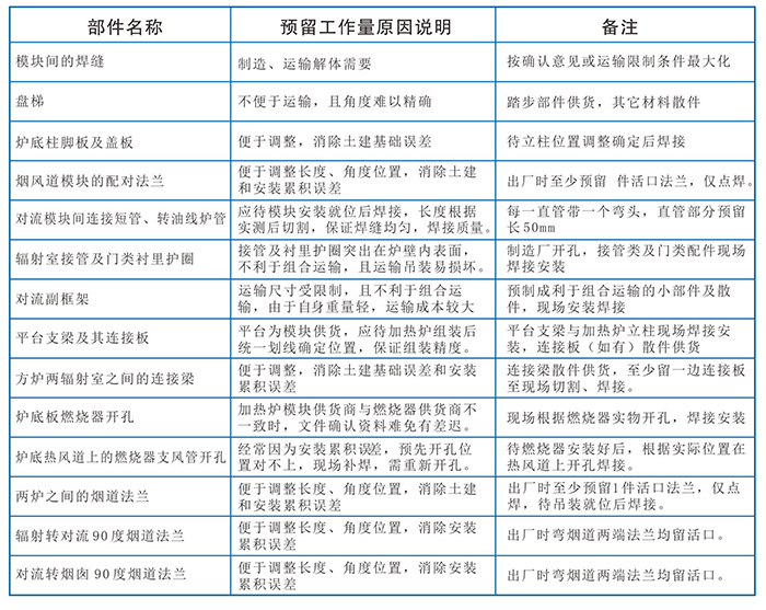 加熱爐及其它爐類產品可進行工廠模塊化設計、預制、運輸及現場安裝。采用思路:工廠深度預制一部件組合運輸一現場快速組對安裝、調試。加熱爐模塊化設計及工廠模塊預制的優點有:供貨范圍和各方責任清晰明確、減輕業主采購工作量、減少現場施工量及制作場地、能更好的保證施工工期和質量、減少現場施工量及制作場地。我們可根據設計總圖提前進行模塊化設計、確定模塊預制方案、模塊運輸方案及現場拼裝方案,再報業主和設計方確認,從而節省設計時間。隨著加熱爐大型化的趨勢,以及道路運輸的進一步規范,工廠預制模塊的尺寸設計應盡量能控制在:長22米,寬3.0米,高度3.3米以內。